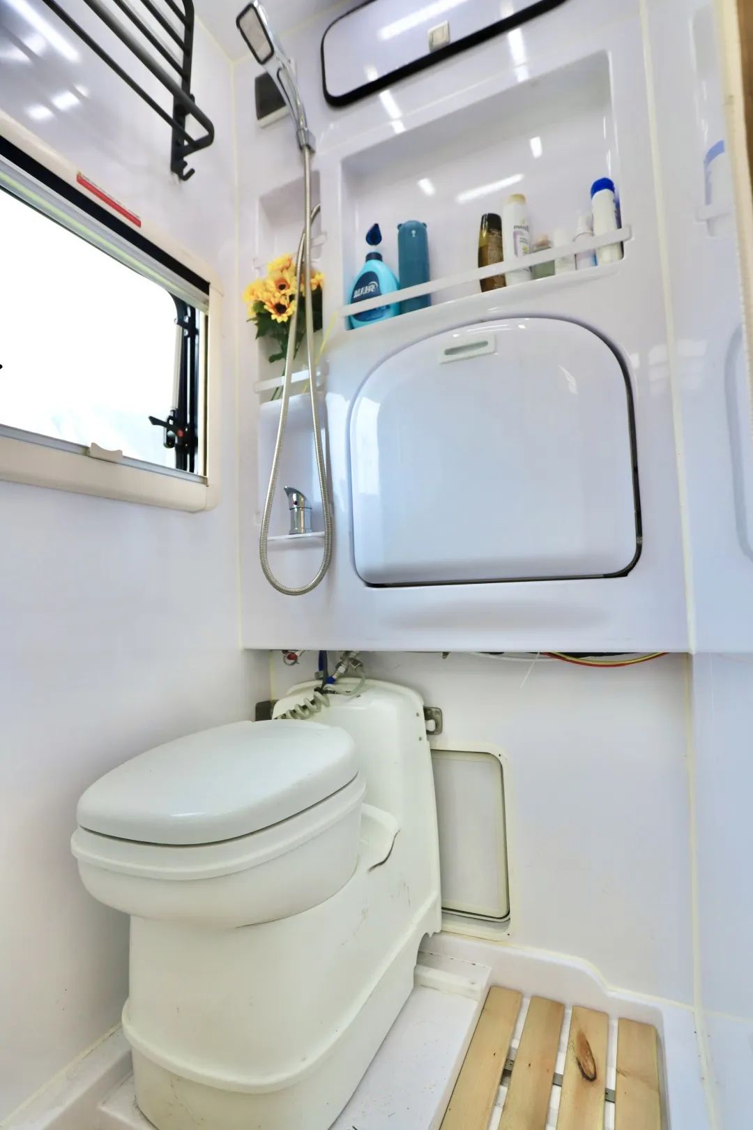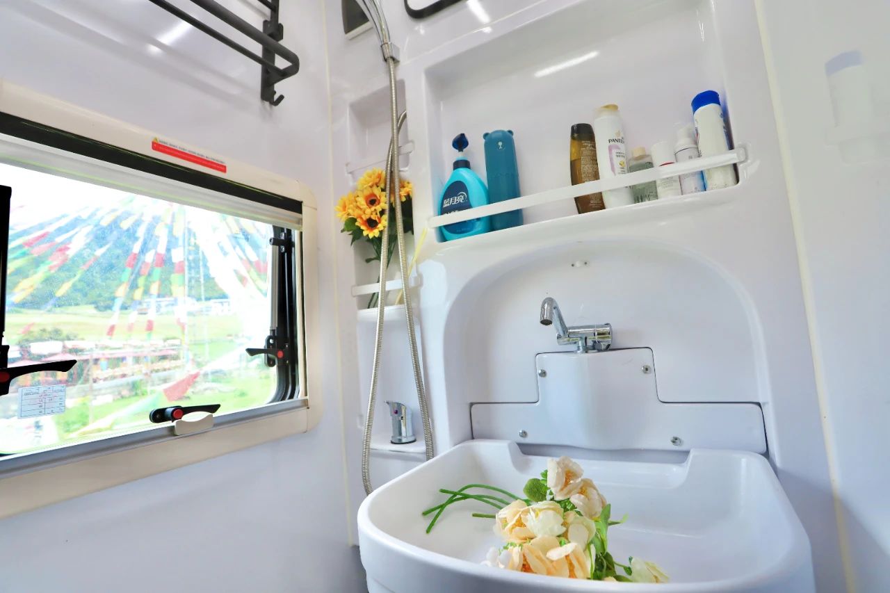 上方折叠洗手盆、储物空间、淋浴花洒、双向换气扇,在车上洗澡洗漱都没有问题。