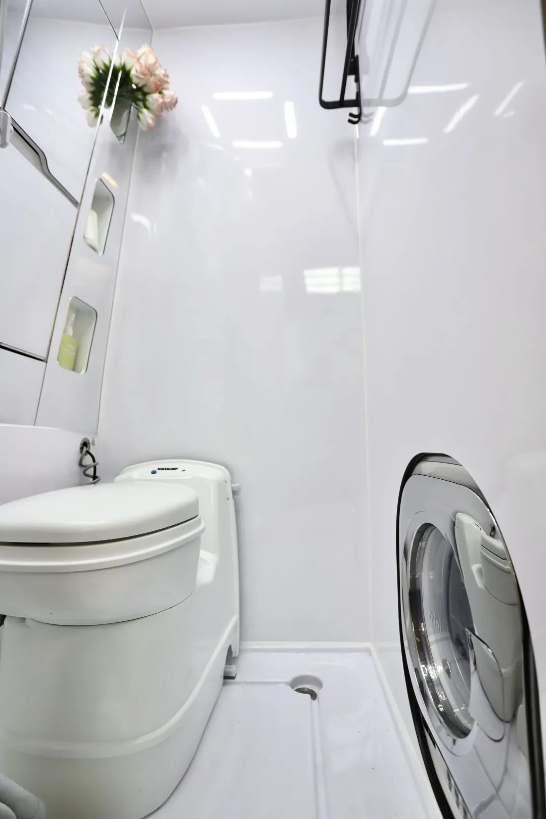 折叠洗手盆和两格储物柜平时看来就是一面镜子墙,比固定式的洗手盆更大,同时空间利用率更高。防水五孔插座,淋浴花洒,可折叠的毛巾架和韩国大宇洗衣机等设施一应俱全,洗漱体验和酒店一样。