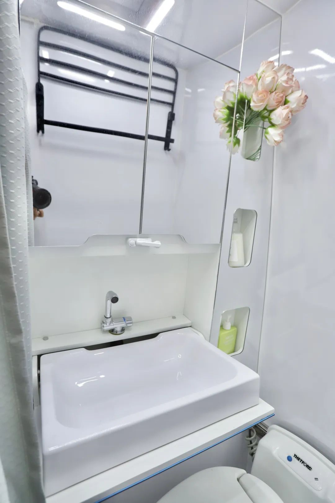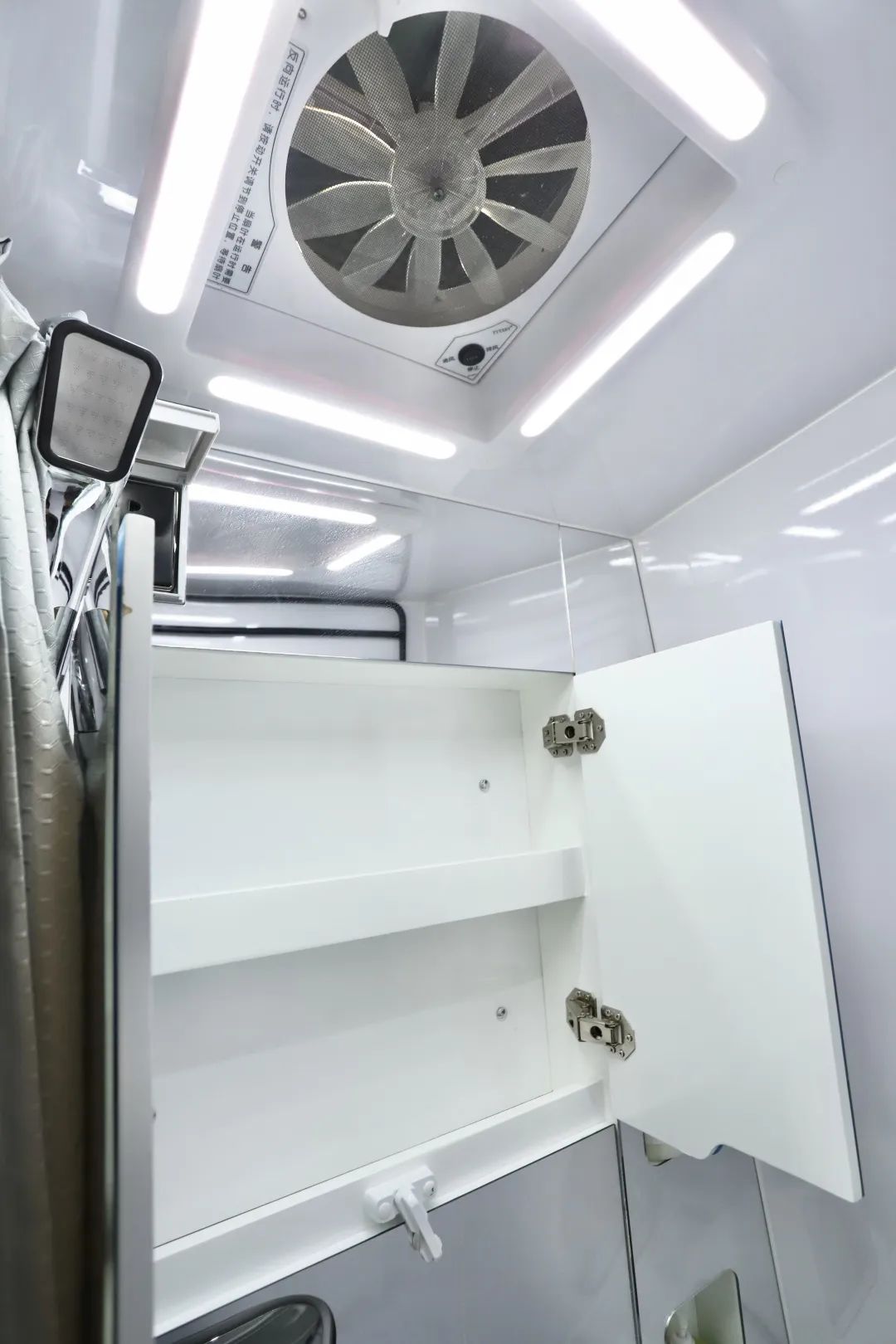 户外做饭时外置厨房就在左手边,上方是一个内外贯通的储物空间,可以放置常用的做饭工具,这样内外拿取都方便。里面还安装了五孔插座和户外花洒,这样烧水洗菜在车外就能进行啦!