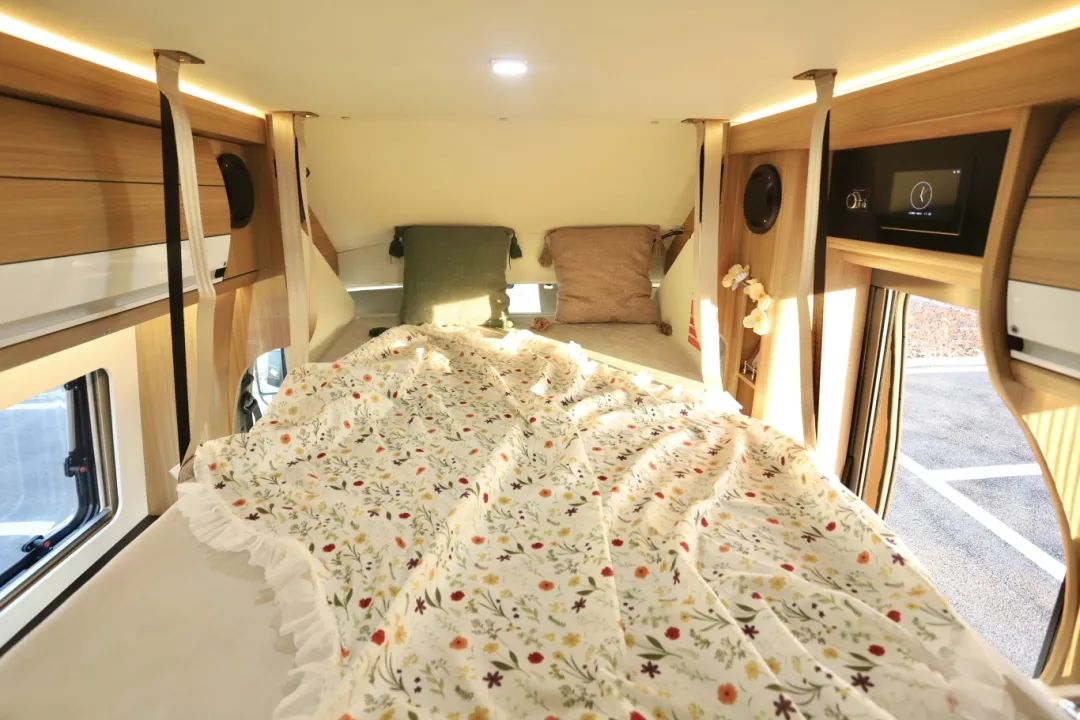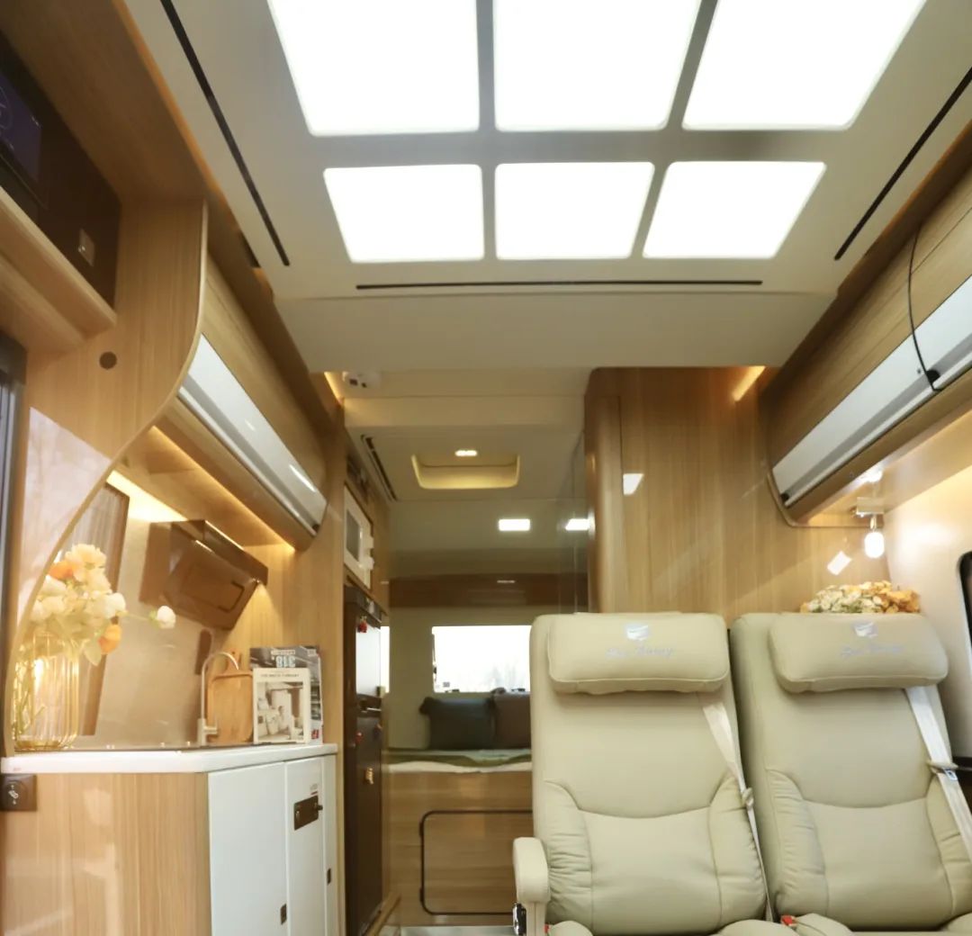 B型房车后拓展80公分、前置升降吊床,还带红酒柜的设计,是您理想中的房车模样吗? 外观展示 FEIXIANG FANGCHE 福特铁C后拓车身用黑白双拼色,经典外观,简约大气。 底盘及车身尺寸 福特新世代V348Pro底盘,2.2T排量、6AMT柴油自动挡变速箱,后驱后双胎的设计,爬坡能力更强,80L油箱搭配20L尿素箱进行使用,符合国六B的排放标准。 车长5米99、宽2米3、车高2米65,通过性优秀。 副驾驶一侧 副驾驶一侧上方就是房车专用的手动户外遮阳棚(2.5m×3m),门上的窗户也是房车专用的双层真空亚克力外推窗,通风换气的同时保温隔音效果也不错。 户外厨房区域 将车门拉开,就是户外操作区域,下方可以拉出一个不锈钢的台面,不仅能当操作台,还可以是就餐时的小餐桌,日常打理起来也非常方便;内部放了便携式柴油炉,5000w高火力,在高原也能正常使用,通过油管取油、无明火,更安全。 内饰展示 FEIXIANG FANGCHE 后置大横床 固定床铺采用横床布局,整体后拓展80公分后便可得到一张1米5乘2米的后置大横床,一家三口都睡得下。 上方安装了家用空调,制冷制热都很快,挂一下隐私帘,床就是一个独立小空间,这样空调的效果更好;车尾部还设置了一扇外推窗,视野更开阔,空调对面还有开放式储物格,放一些纸巾以及手机数据线之类的比较方便。 床下也为您预留了储物空间,大件行李和行车工具都可以放在此处,而且采用内外贯通式设计,车内车外均可拿取。 一键式升降吊床 前方会客厅九宫格灯池上方还隐藏了一张双人吊床,1米3乘2米的尺寸,床板由整张铝板铺设并与车头大梁相连接,再加上多条承重带的加持,整张吊床承重可达600斤。 多功能会客厅 下方就是会客厅,主副驾能进行180度旋转,中排采用两张航空座椅,靠背的设计符合人体曲线,支持前后左右以及靠背腿托的调节。 桌子采用一键式升降折叠桌,不使用的情况下给我们提供一个超开阔的空间,使用的时候一键升起,53*70cm、53*120cm两种尺寸供您选择。 会客厅前方还安装了32寸的液晶网络电视,支持联网投屏以及角度的调节,看看实时新闻以及综艺电视都不错。 内置厨房区域 对面内置厨房区域,打开盖板,不锈钢水盆搭配冷热水调节水龙头,旁边为内置柴油炉,微晶面板、无明火设计,最右边则为反渗透净水设备,保证您旅途路上的饮水安全。 上方下沉式抽油烟机,搭配本车的新风系统,不用担心车内做饭的油烟问题,铝合金储物吊柜更加轻量化,平时放各种厨房用品以及调味品。 旁边96L双开门冰箱、微波炉,上放还有隐藏平面当做备菜区,大衣柜可放置长款外套、连衣裙等一些不易叠放的衣物。 可拓展式卫生间 卫生间位于房车中部,外面是一整面镜子墙,采用亚克力的材质,门板能进行翻折,内部的使用空间更大。 内部安装电动粉碎马桶、2.5公斤的洗衣机、折叠洗手盆、淋浴花洒、防水插座以及顶部双向换气扇,方便卫生间的通风换气。 出来卫生间,旁边墙壁还能拉出来一个多层储物柜,用来放红酒再合适不过了,下方的平台区还能放点咖啡机或者榨汁机,利用好了每一份空间! 整车非常通透,功能区也比较明确,采用的板材也都是房车专用的E0级别环保板材,不仅美观,而且无甲醛无异味。 水电配置 水电方面本车配备了3000w逆变器、800AH锂电池、300W太阳能板;180L清水箱、60L灰水箱。 怎么样,屏幕前的车友们,这台车你还中意不?欢迎来厂家看一看!仅此一台,您来就是您的!
