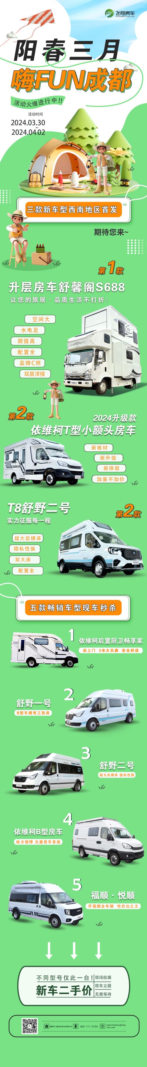 云贵川大军特别注意啦!! 西南地区请静等飞翔的上门“服务” 2024年3月30-4月2日 西南地区新车首发暨第四届飞翔房车成都车友活动 即将开启!!! 千里奔赴,不为别的,只为让您在家门口看到新车:2024年全新升级版依维柯T、蓝牌C照可开的最大号房车舒馨阁S688、期待已久的福特T8—舒野二号西南地区首发!!! 还有五款畅销现车秒杀价等您来抢:依维柯后置厨卫、舒野一号、舒野二号、依维柯B、福顺·悦顺,拒绝套路,直接秒杀!一降到底,现车立提!