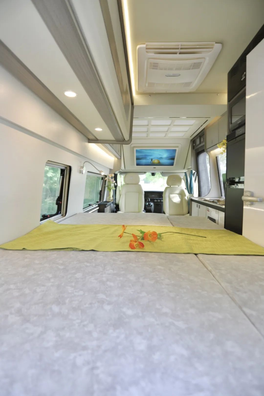 睡卧区前方就是会客厅,两个汽车独立座椅可以做到前后左右进行滑动,椅背还能进行调节,米色设计,更符合车内上装,看起来自然不突兀。