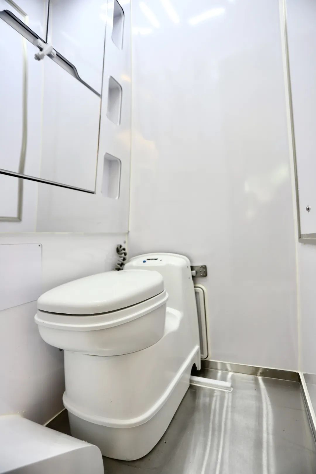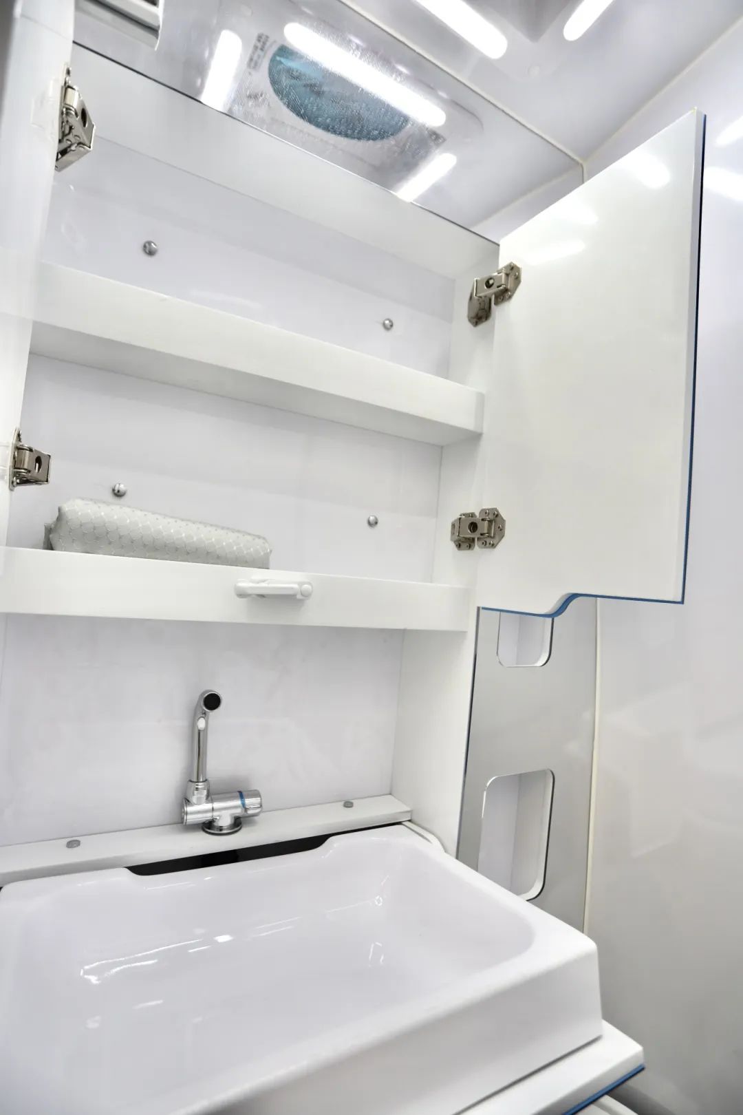 衣柜旁边则为本车卫生间区域,门口一面超大的亚克力全身镜,方便出门时照看日常的穿搭。