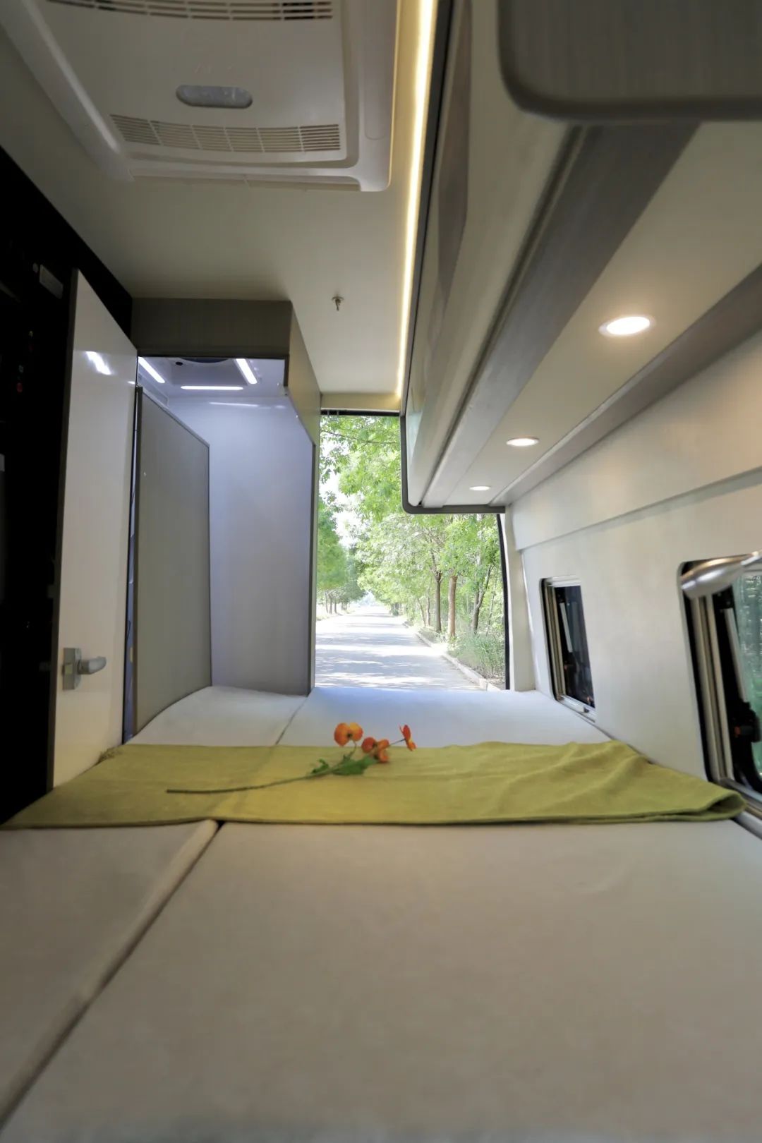 固定纵床,尺寸为0.9*2米,可容纳一人使用,但如果是夫妻两人,完全不够睡,所以它加了拓展设计,通过卫生间墙板电动伸缩,尺寸就能变为1米2*2米,两人使用很足够,下方还有内外贯通式的储物空间,可容纳您出行的行李物品。